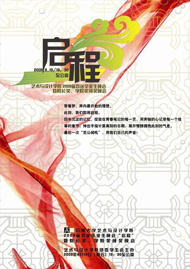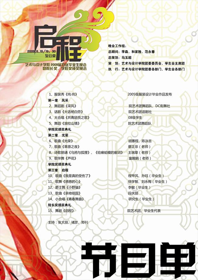 又是一个离别的季节,公司2005级本科生、2006级研究生即将离开母校,走向社会,值此之际,公司团委员工会筹办了《启程——2009届欢送毕业生晚会暨经理奖、学院奖颁奖晚会》。晚会将在6月19日在有着浓郁文化氛围的至公堂上演。本次晚会节目异彩纷呈,不仅有院艺术团、街舞社、话剧社等奉献的精彩节目,值得关注的还有2005级服装设计系毕业设计发布和针对毕业生的经理奖、学院奖的颁奖典礼,更有毕业生和辛勤教育了他们的老师们的精彩表演。