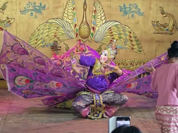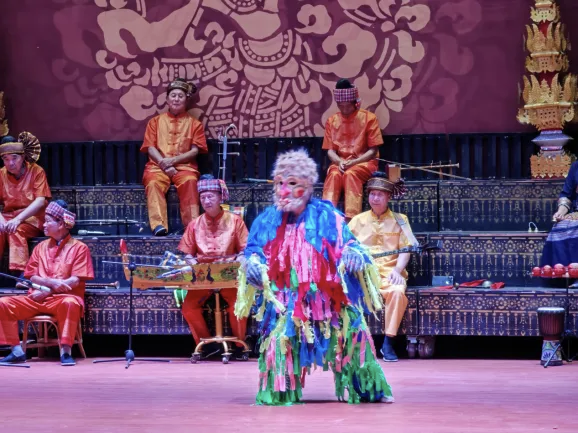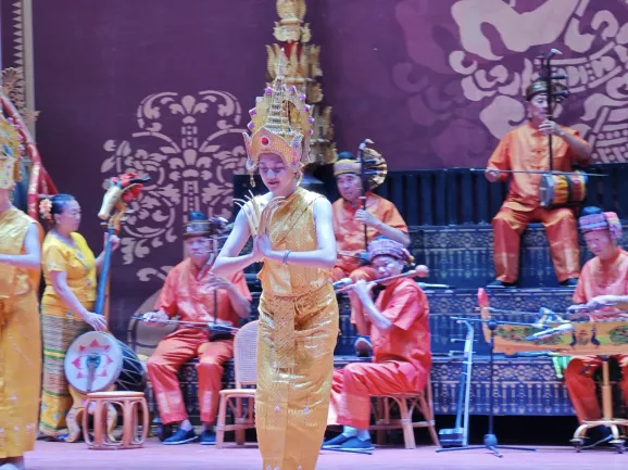 随后,实践团进入宣抚司署表演厅观看孟连非遗项目“宣抚司礼仪乐舞”,亲眼见证傣族、拉祜族、佤族艺人共同演绎“所楠窝罕”“长甲舞”“蜡条舞”“长甲舞”等一系列传统曲目——乐舞中既保留傣族的舞姿,又融入中原民族的元素韵律,充分展现了各民族文化“各美其美、美美与共”的融合特质。师生们在考察学习中深刻体会到非遗不是孤立的‘文化标本’,而是铸牢中华民族共同体意识生动的活态载体。