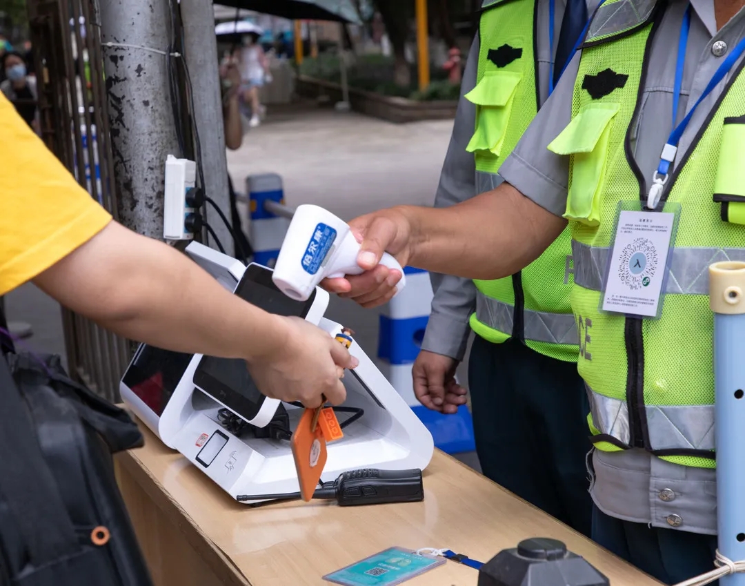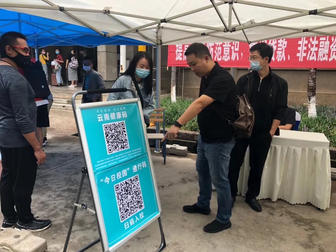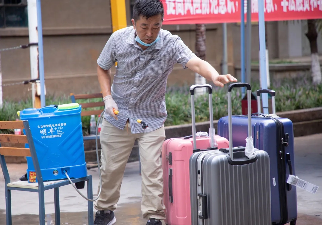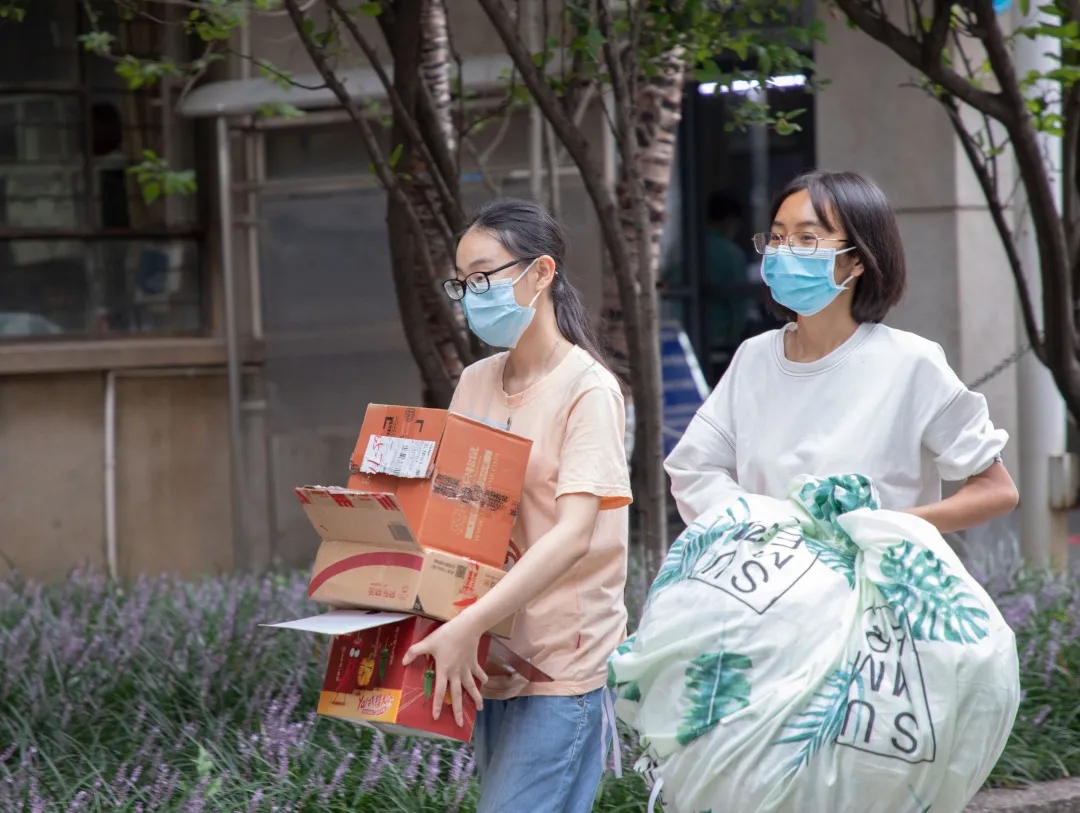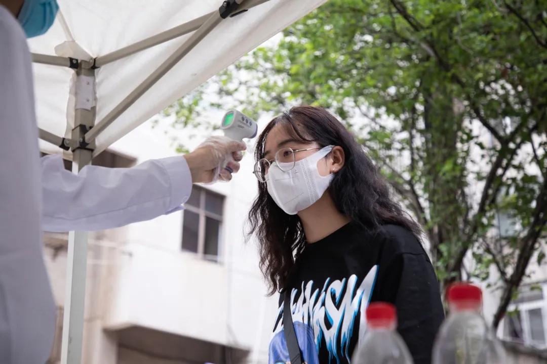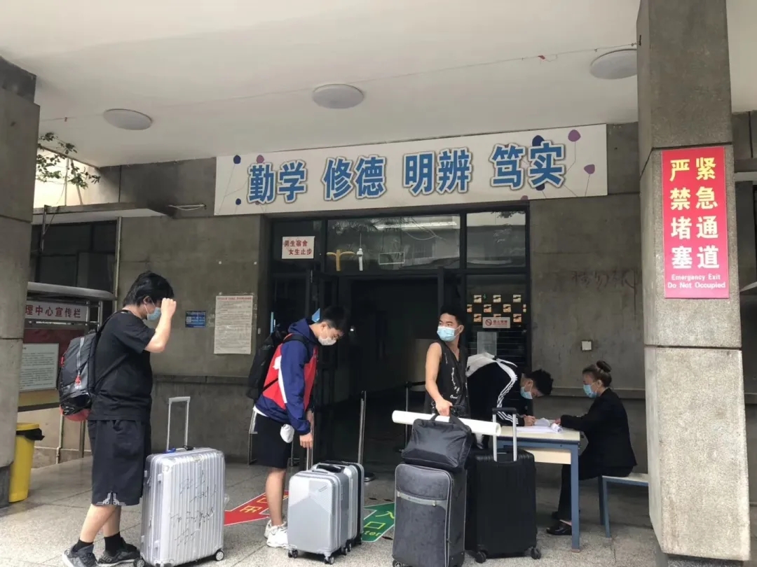在宿舍门口设置多个安全保障通道,同学们在老师领导,以及各校职工、志愿者的引导下保持距离,有序的进行核检身份,体温测量和行李消毒等措施。三个环节的体温测试,层层严谨;扫码(健康码、今日校园通行码)进入,进一步核实信息;杀菌消毒,更进一步确保安全。