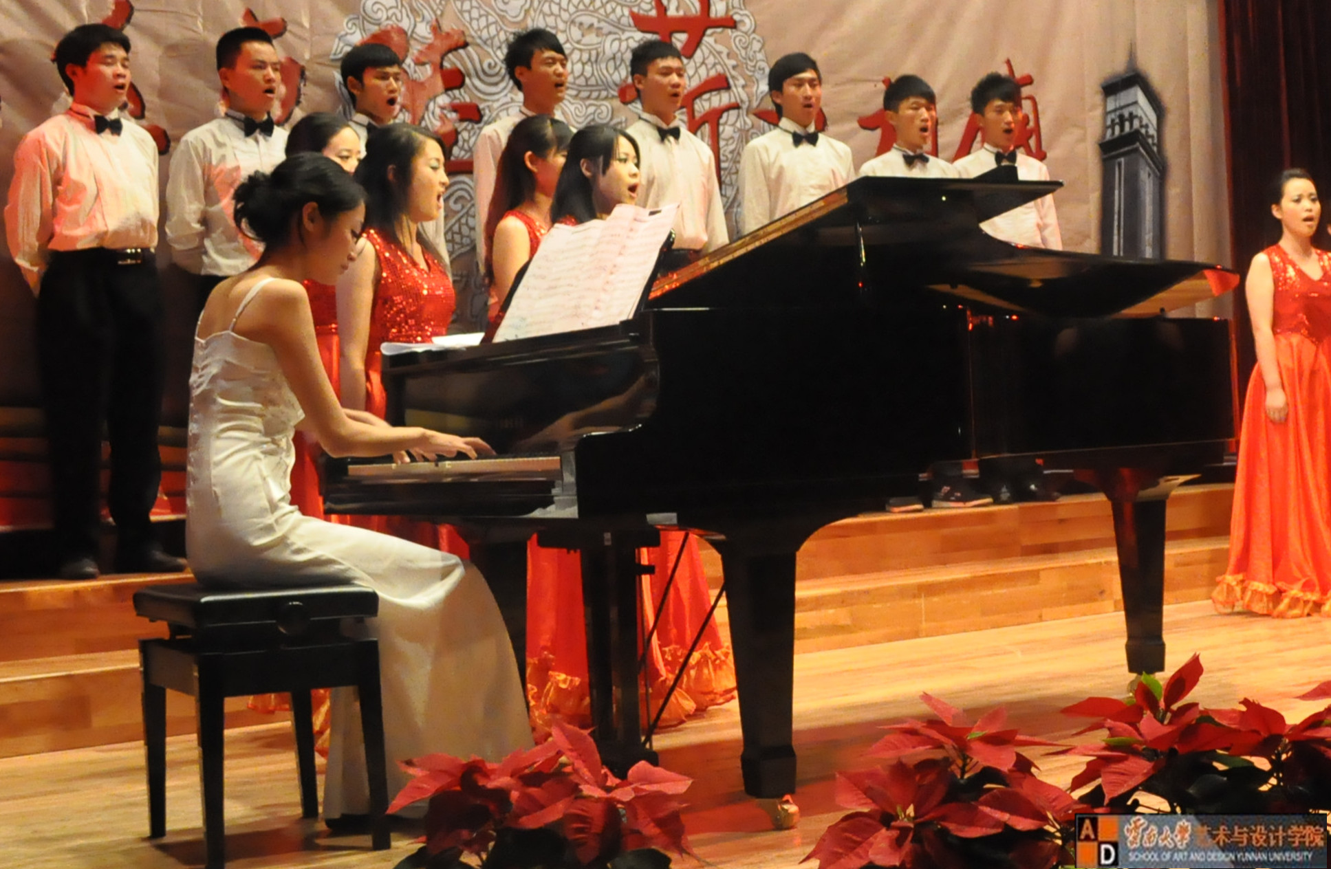09级音乐班同学表演的《和你一样》,用手语舞的方式表达了老员工活和同学的友谊。08级音乐学毕业生张含同学的钢琴独奏《加勒比海盗》展现了演奏者精湛的技术。
