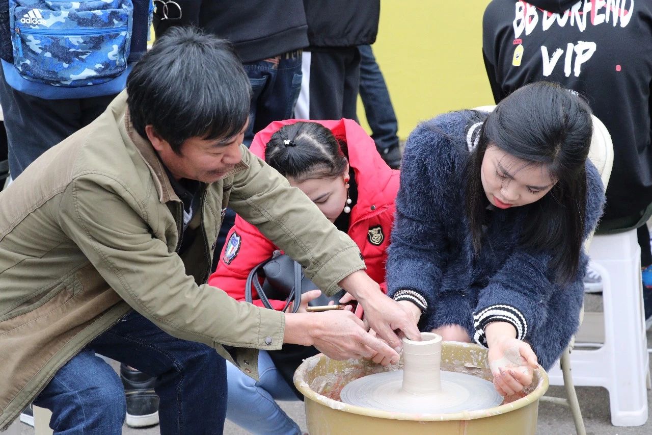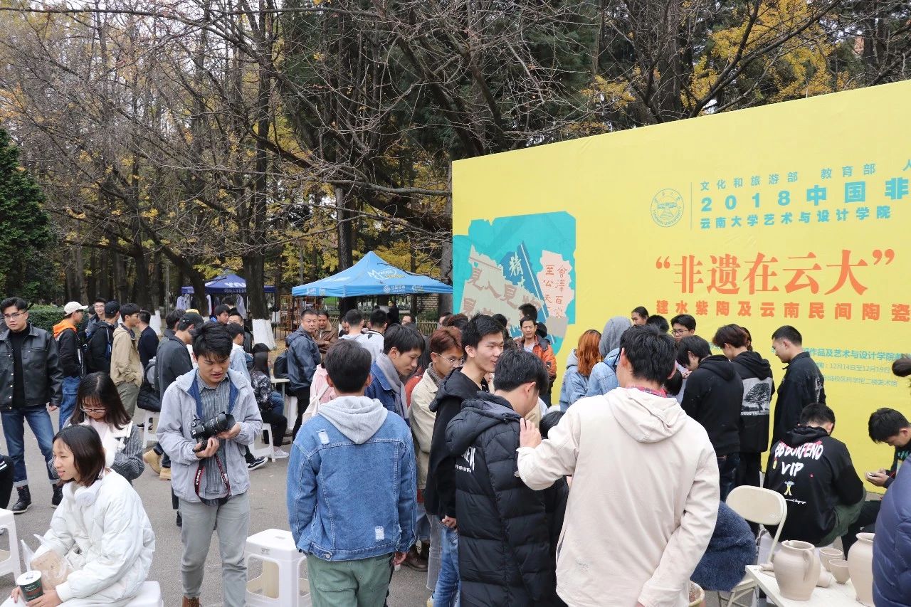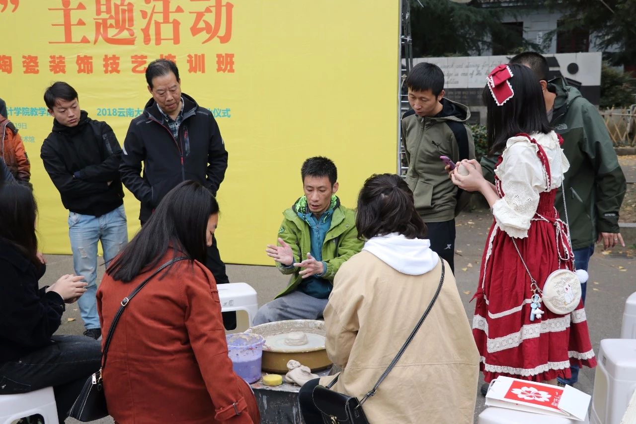 14:00“非遗在云大”非遗传人现场教学活动,在东陆广场举行,蒋家才(研培班学员,省级工艺大师,代表性传承人),高翔(研培班学员,代表性传承人),卢用祥(研培班学员,代表性传承人),杨诚(研培班学员,代表性传承人),三猛(研培班学员),蒋春良(研培班学员),李鑫鑫(研培班学员),为现场400余名同学现场授课,教授紫陶拉坯技艺。