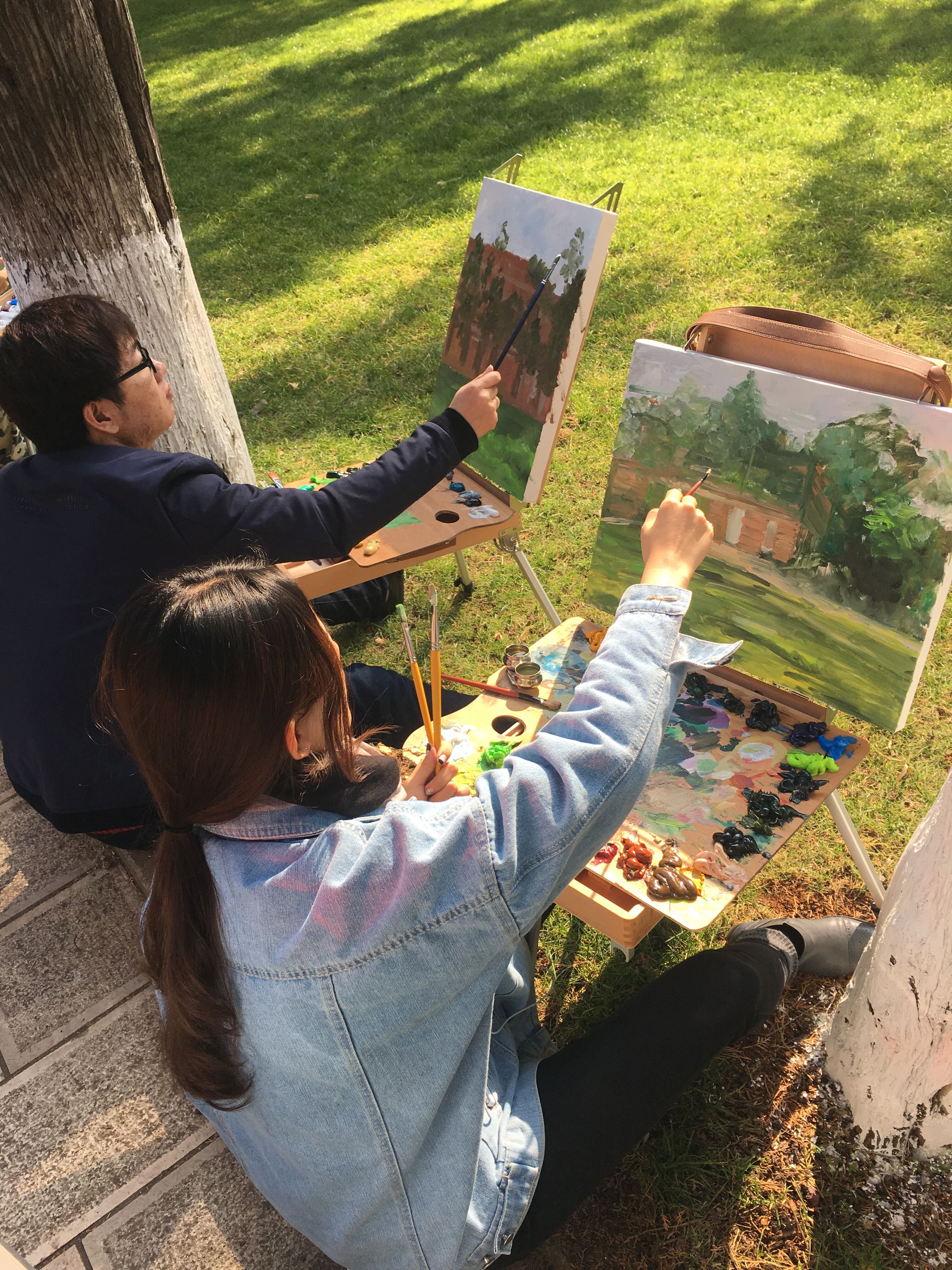在草地的另一边,张志明教授刚刚放下手中的画笔,员工们认真观察了老师的示范后调整画架、调配颜料、找到合适的角度位置后准备开始习作。张教授把未干的画作放在一边,在旁的石凳坐下亲切地接受了我的采访。他说,现在社会上文化和艺术都显出浮躁之气,有些教师和员工并没有静心致力于教与学中,教师应该回归经典、不一味求异、亲身示范,不断激发员工的艺术天赋。员工应该秉持刻苦踏实精神,继承民族艺术的文化脉络,打好基础一步步积累学习,树立健康的审美情趣和正确的主流意识。
