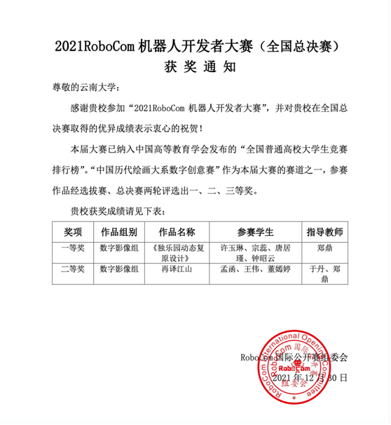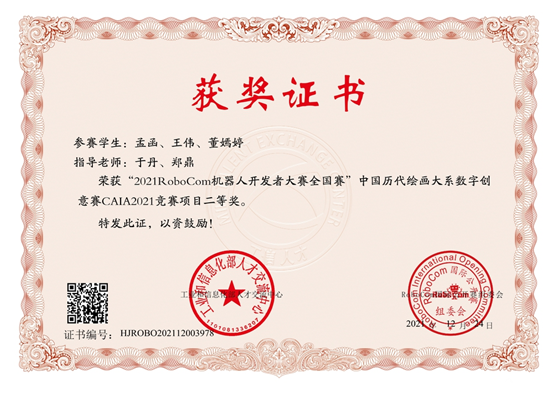 近日,由工业和信息化部人才交流中心、RoboCom国际公开赛组委会联合主办的“2021RoboCom机器人开发者大赛”全国总决赛落下帷幕。由公司伟德国际victor·1946源自郑鼎老师指导,许玉琳、宗蕊、唐居瑾、钟昭云创作的《独乐园动态复原设计》荣获中国历代绘画大系数字创意赛一等奖,由伟德国际victor·1946源自于丹老师指导,孟函、王伟、董嫣婷创作的《再译江山》荣获中国历代绘画大系数字创意赛二等奖,郑鼎老师获优秀指导教师奖。