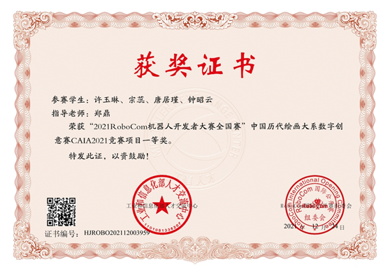 RoboCom机器人开发者大赛属中国高等教育学会《全国普通高校教师教学竞赛排行榜》项目,是教育部学科竞赛排行榜57个国家级赛事之一。本届大赛自启动以来,受到全国高校师生的广泛关注和热烈响应,吸引了来自全国28个省、市的200所高校近3000名选手参赛,其中的中国历代绘画大系数字创意赛共设全国一等奖3项、二等奖4项、三等奖5项。